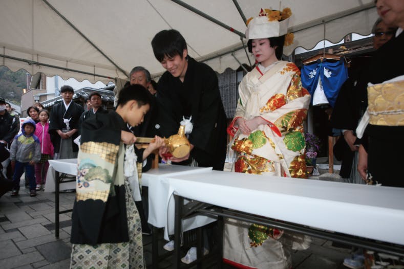 結びの盃でもある三三九度は、「おさかなここに」という港町ならではの掛け声とともに、小さな子供たちによって酌が行われる。