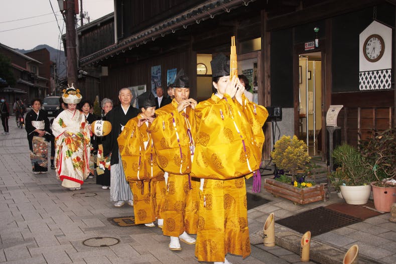 しかし、平成26年「世界的にも大変珍しい」この伝統文化を復活させようと、市民有志の実行委員会を立ち上げ、当時を再現した結婚式イベントを開催しました。新郎新婦や親族からも好評で、大勢の見物人も集まって下さいました。