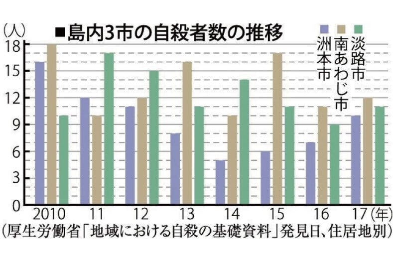 厚生労働省が公表している「地域における自殺の基礎資料」(発生日、居住地の数値)によると、2010~17年までの自殺者数は洲本市75人、南あわじ市106人、淡路市98人。