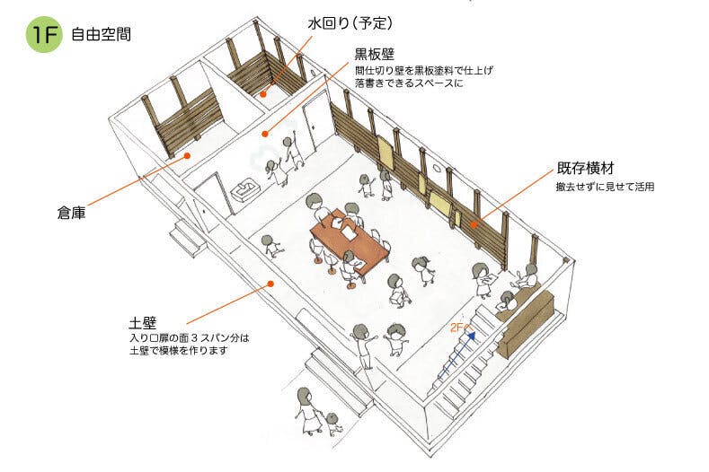 古くなっていた一階の土壁は解体して活動空間を広げ、解体で出た土は二階の土壁補修に再利用しています。