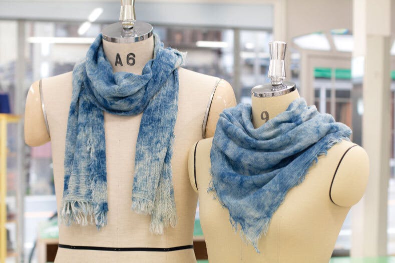 偶然に生まれる染の濃淡は、雲と空がさわやかに交わったような模様を描き出し、世界に一つだけのストールを生み出します。