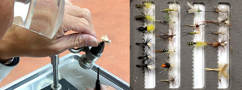 テンカラ釣りのシンプルな毛鉤やフライフィッシングの鮮やかな毛鉤。小さく繊細な材料を細い糸で巻くなど細かな作業となります。