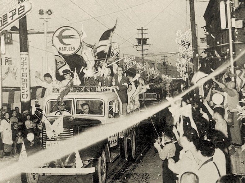 ▲1957年 静岡国体優勝パレード(藤枝市白子商店街)