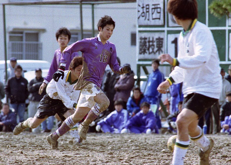 ▲2001年 県高校サッカー新人戦 泥の中で果敢にドリブルする成岡翔(藤枝東高グラウンド)