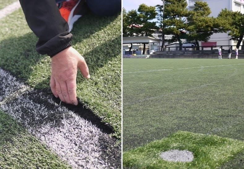 ところが、新たな問題が浮上しました。人工芝の劣化です。8年間にわたってサッカー部の活動に、あるいは体育の授業にとフル回転していたため、人工芝が予想をはるかに上回る速度で傷み始めました。全体に黒ずみ、摩耗も目立ち出しました。あちらこちらに凹凸ができ、滑るように繋がっていたパスが波打つようになりました。荒れた表面に足を取られ、骨折事故も発生しました。