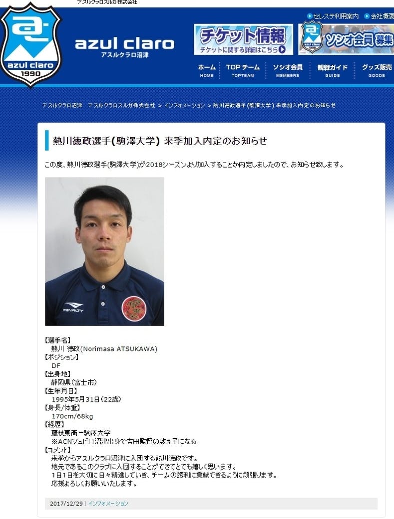 2014年に東高を卒業し、駒澤大学4年の熱川徳政選手が、先輩の中山雅史選手と同じ「アスルクラロ沼津」に加入することが昨日発表されました。