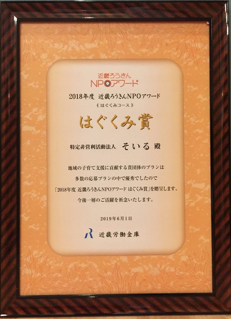 「あそびの広場」や「学習会」などのそいるの活動が、2018年度近畿ろうきんNPOアワードはぐくみ賞を受賞しました。