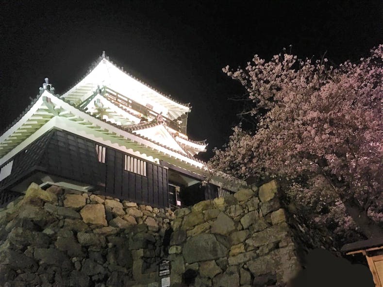 ▲夜の浜松城と桜。日が暮れてライトアップされた浜松城はとてもきれいです。