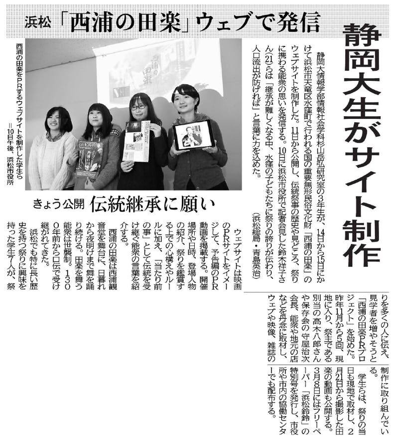 ★浜松「西浦の田楽」ウェブで発信 静岡大生がサイト制作