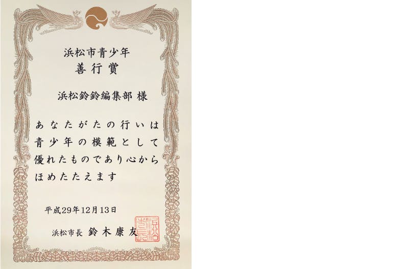 私たちの『浜松鈴鈴』の取材、編集、発行が、浜松市や人々に貢献していることが認められました。
