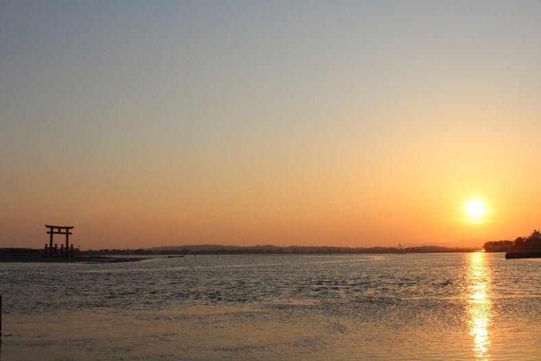▲光の道が眩しい夕暮れの浜名湖。