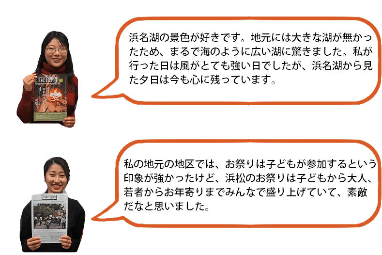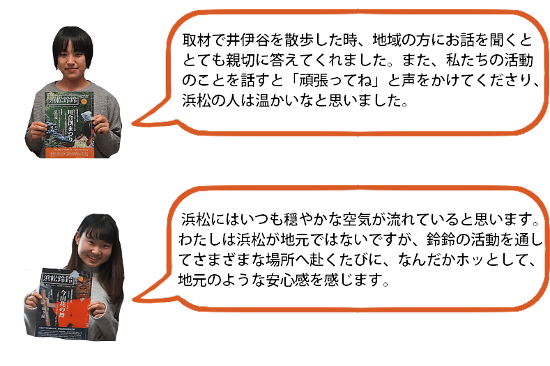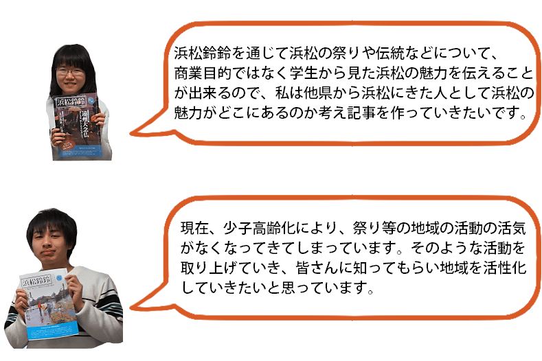『浜松鈴鈴』ではこれまで、浜松の歴史や伝統、文化など“昔”のことに焦点を当てた取材をメインに行ってきました。それも継続しつつ、これからは今まで以上に浜松の“今”に注目した取材をしていければと思っています。学生ならではのフットワークの軽さを活かし、「浜松では今、何が流行っているのか、人気があるのか」などについても取材していきたいと考えています。また『浜松鈴鈴』は現在、市役所・協働センターを中心に、約800部配布していますが、今後は駅や病院など、配布場所・配布数の拡大も視野に入れ、日々の活動を行っていきたいと考えています。取り扱う記事の幅を広げ、市民の方々が目にする機会を増やしていくことで、より幅広い世代に認知してもらうことを目指していきます。