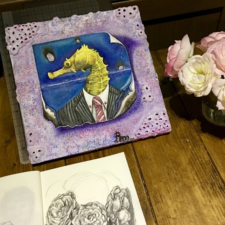約十年、絵を描くことを辞め、水商売など仕事を転々としていましたが、やっぱり自分には絵しかないと思い、最近また描き始めました、今はデザイン関係の作業所に通っています。