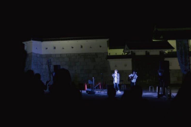 赤穂城跡の本丸前で夜間は幻想的なライティングで楽しめます。