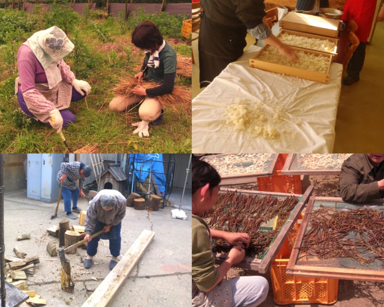 「布目の里」がある山添村は大阪や奈良の都市部に近いにもかかわらず、これまで開発の波に巻き込まれることがありませんでした。そのため昔ながらの農村の景観が残り、古い暮らしが受け継がれてきました。おばあちゃんの年代の方々は、代々受け継がれてきたその土地のその家の方法で保存食作りや、祭事などに必要な手仕事を当たり前のこととして行ってきました。布目の里の取り組みも地元のおじいちゃん、おばあちゃんに教えられ、助けて頂きながら続けてこられたことが多くあります。