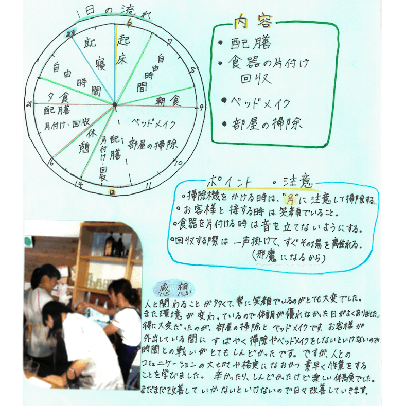 就業体験実習、2年生の夏休みに7泊8日かけて行うようですが、その様子は生徒のレポートを読んでいただけけると伝わってくるかと思います。