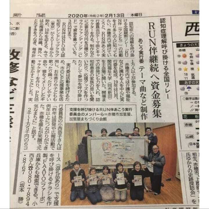 『RUN伴あこう2019』2019は私達にとってもChallengeの年でした新たなChallengeを6つみなさんのご協力のもとさせていただく事ができました。一つずつ、ご紹介させていただきながら、昨年のRUN伴あこうを振り返りたいと思いますキックオフミーティングは6月19日加里屋まちづくり会館でした。認知症があってもなくても住みやすいまちにするために当事者ご家族の方のお話をお聞きして私達に何ができるか、みんなで考えよう当事者ご家族の方に率直にありのままをお話頂けました。ありがとうございます。お集まり頂いた、たくさんの方達と一緒に考えました。そして、答えは『認知症についての偏見をなくそう』そのために『私達の活動をもっと知ってもらうべき』そんな想いでRUN伴あこう2019キックオフです️そして、その先に見えている私達が目指すべきものは『誰もが笑顔で元気なあこう』です。