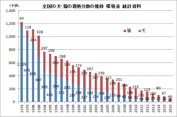 ▲全国の犬・猫の殺処分数の推移(環境省統計資料より)