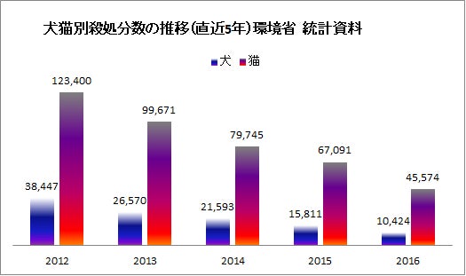 ▲直近5年間の犬・猫別殺処分数の推移(環境省統計資料より)
