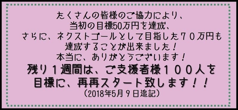 2018/05/17 12:495月16日をもちまして、 支援期間が終了し、 無事プロジェクトを 達成することができました!! 最終週で目指していた 100人達成も上回り、 111人の方にご支援頂くことが できました(;o;) ご支援頂いた皆様は もちろんのこと、 SNSでの拡散や、 友人へのご紹介などで ご協力頂いた数多くの皆様、 心より感謝申し上げます。 当初の想像よりはるかに多くの方が、 プロジェクトに興味を持って下さり、 本当に嬉しく思います!! まだまだ 動き出したばかりですが、 今回のご支援を励みに、 まずはオープン目指して 準備を頑張って参ります。 合わせて、 リターン品の準備も 開始致しますので、 少々お待ち頂けると 幸いです!! これからも、 ヒトヤ堂を 宜しくお願い致します! もっと見る
