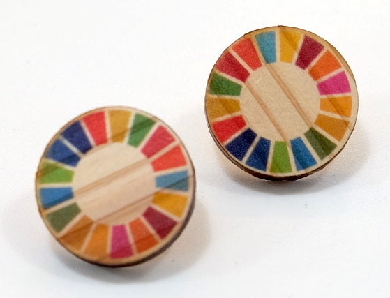 ↑石川の間伐材を使って作ったSDGsバッジ(穴あり:国連本部で売っているバッジと同じデザインです)※一点物ですので、木目は一つ一つ異なります。