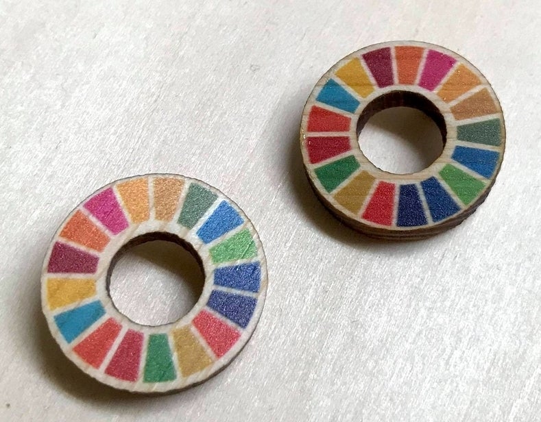 ↑石川の間伐材を使って作ったSDGsバッジ(穴あり:国連本部で売っているバッジと同じデザインです)※一点物ですので、木目は一つ一つ異なります。
