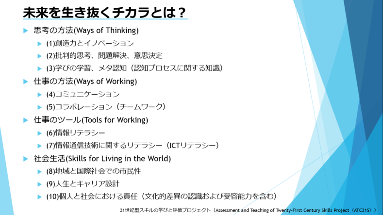 一通り出した後に、21世紀型スキルの学びと評価プロジェクト(Assessment and Teaching of Twenty-First Century Skills Project〈ATC21S〉)による21世紀型スキルを紹介。