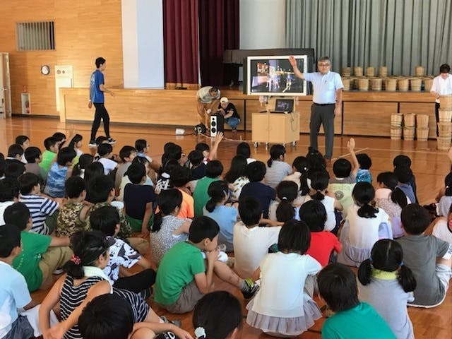 毎年、学年行事の一環として樽はやし大会に参加している小学校もあり、多くの小学生が参加しています。講師の方が授業に参加し、樽はやし大会の歴史を語り、ひもの結び方、叩き方を教えています。