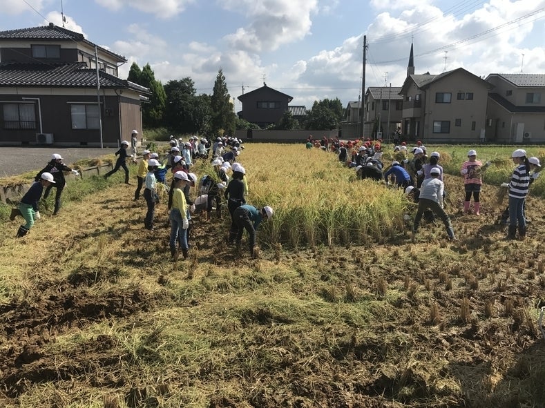 ▲小学生との稲刈り