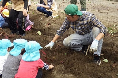▲農業青年と園児のサツマイモと収穫