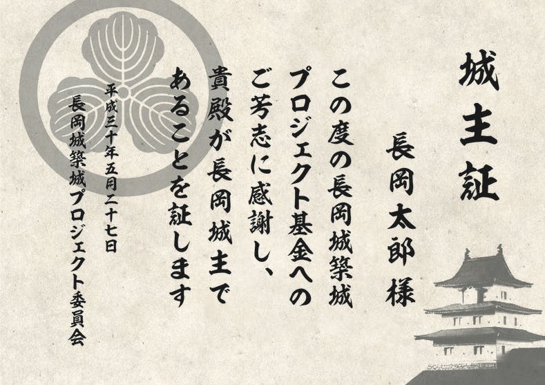 1口4,000円を支援いただくと、名入りの城主証を贈呈させていただきます。