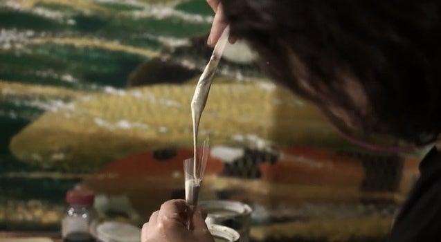 先染めって聞いたことありますか? 対義語が、後染めですね。 加賀友禅は、「染めのきもの」と呼ばれます。 白い糸の状態で反物サイズに織ってから、筆で染めていくから、後染めです。 京友禅、琉球紅型などです。 牛首紬や能登上布は、「織・おりのきもの」呼ばれます。 糸を染めてから織る。なので紬・つむぎ系は先染めです。 ミンサー織り、大島紬などです。 何と何を混ぜるとこの色になるか、というのを追及して研究を重ねてきた門外不出の秘伝の書があるそうです。 色のレシピ本ですね。 牛首紬でもう一つ特徴的なのが「クロユリ染め」です。 同じクロユリなのに、いろんな色に染まる・・・だと!! びっくりです。 触媒を変えることで、発色が変わります。 ピンク、紫、黄色、緑、グレー綺麗な色に染まった糸を 今度は「整経(せいけい)」という工程です。