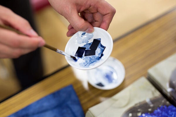 で図案が出来上がったら、今度は生地に映していきます。 どんなふうにするかって、驚きのアナログです。下から光あてるんです。 ガラスのテーブルに図案(ずあん)が書かれた紙置いて、その上に生地(きじ)を置きます。 そしてガラステーブルの下から光をあてると、生地にうっすら柄が見えますよね。 それをなぞって生地に書いていきます。これが下絵(したえ)です。 書く道具は筆先の繊細な細い筆で、インク(という表現は?だけど)は青花(あおばな)を使います。 青花(あおばな)は琵琶湖の周りで、真夏の早朝にだけ咲く、直径約3㎝の綺麗な青紫のお花です。露草(つゆくさ)と同じ色で学術的には兄弟だけど4倍くらいの大きさで、今ではあまり採ることができないそうです。 このお花からから抽出した色素を和紙にしみこませて乾燥、しみ込ませて乾燥、しみ込ませて乾燥を繰り返して青花紙(あおばながみ)が作られるそうです万葉集にも出てくるくらい昔から作られてきました。 最盛期には300軒で作っていたけど、今では一軒のみ。そうやって大切に大切に作られた青花紙は、染料屋さんで売られていて、作家さんの手元に届きます。 花歴さんよりお写真お借りしました 作家さんが筆先につけて生地に下絵を書くために使う時には、お水で少しずつ戻して使います。 この青花の特徴は、水で洗い流すと消えるということです。 友禅染(ゆうぜんぞめ)の特徴は糊(のり)を洗い流して、白い枠が残ることです。 そのためのその糊を置く場所の下書きとなる、青花(あおばな)も洗ったら消えてほしいんです。 では次は糊置きの工程です。