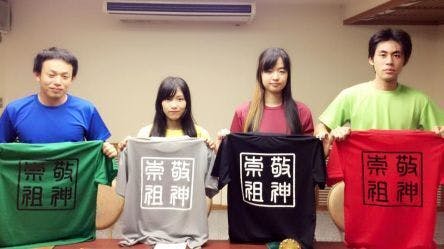 もともとは島根県安来市の母里(もり)氏子青年会のTシャツで、神を敬い祖先を崇めるという神道の心を表す言葉を、背中に大きくプリントしたものです。
