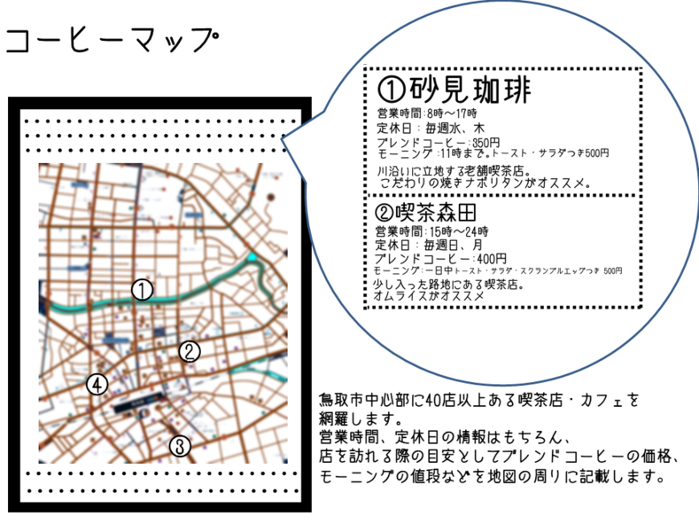 また、コーヒーマップには鳥取市中心市街地のカフェマップを掲載し、参考にしながら街歩きを行える内容とします。