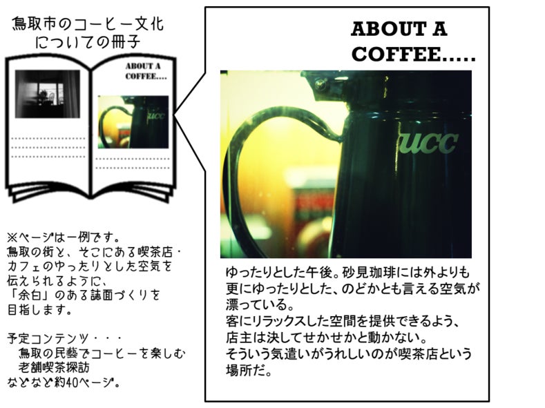 この冊子は、鳥取市内の喫茶店・カフェに設置させていただくことで、そこを訪れた方に読んでいただき、他のお店にも回りたくなったり、また鳥取市を訪れたくなったりするのを狙いとしています。