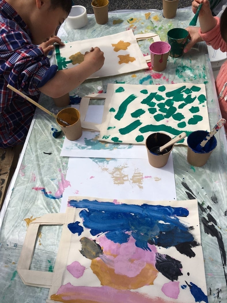イベントでは、屋上に直接ペイントする他、エコバック製作ワークショップも行いました。子供たちが自由にペイントしたエコバックにClaraさんが仕上げを施し、世界に1つしかないバッグを作り上げました。