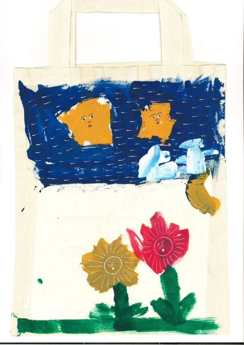 (右:”子供たちのペイント”×”Claraさん”により作成されたバッグ)