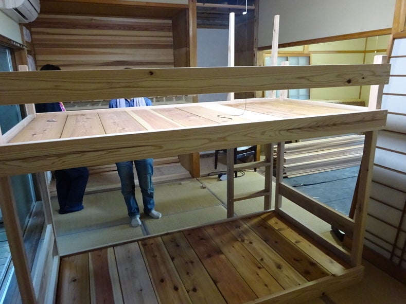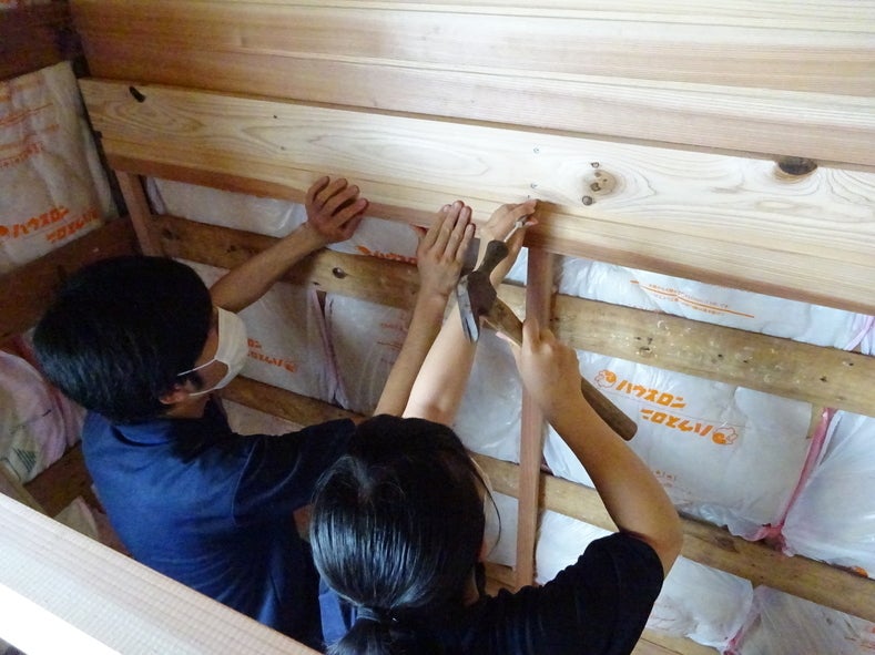 智頭杉に包まれるように眠るベッドを作るべく細い板を組み合わせてトントン貼り付けていきます。