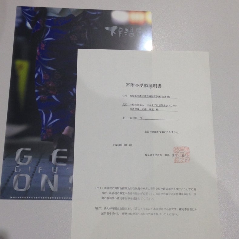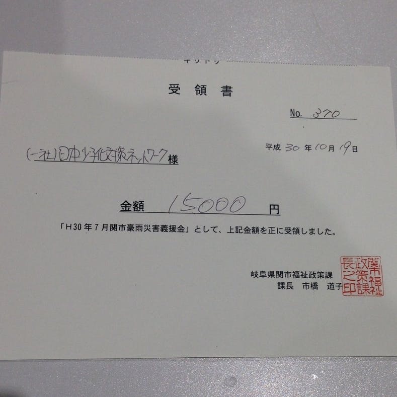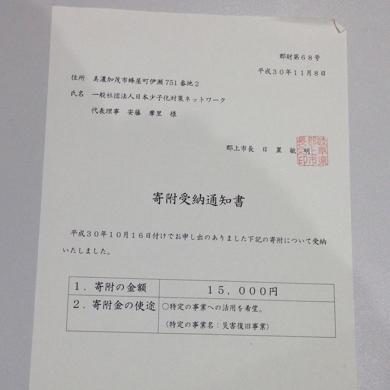 FAAVO美濃國で募集させていただいた支援金の他、FAAVO美濃國 事務局の運営を行っております(一社)日本少子化対策ネットワークを通じてお寄せいただいた支援金を加え、合計45,000円を寄付させていただきました。