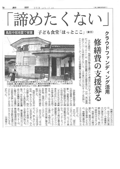 11月20日の「日本海新聞」に「ほっとここ」の記事を掲載いただきました。 みなさまのご支援、応援のおかげです。 達成率が40%に到達し、 折り返しまであと一歩です。 更なる応援よろしくお願いします。
