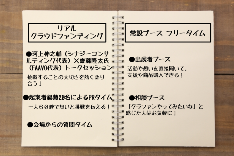 クラファンを”リアル”に感じてもらうため、演壇での「リアルクラウドファンディング」と常設ブースフリータイムの2部構成にしました。
