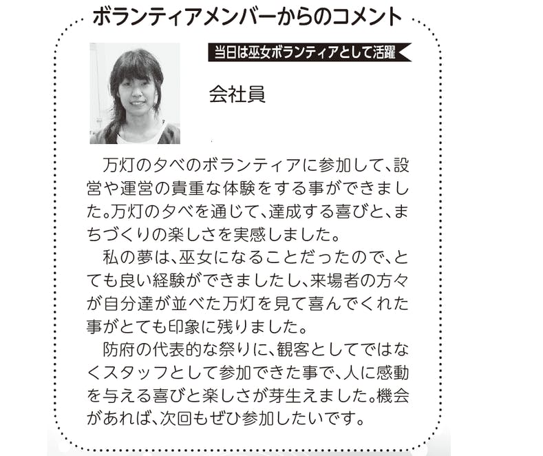 ご覧いただいた通り、万灯のゆうべには多くのボランティア(市民)が参加しております。