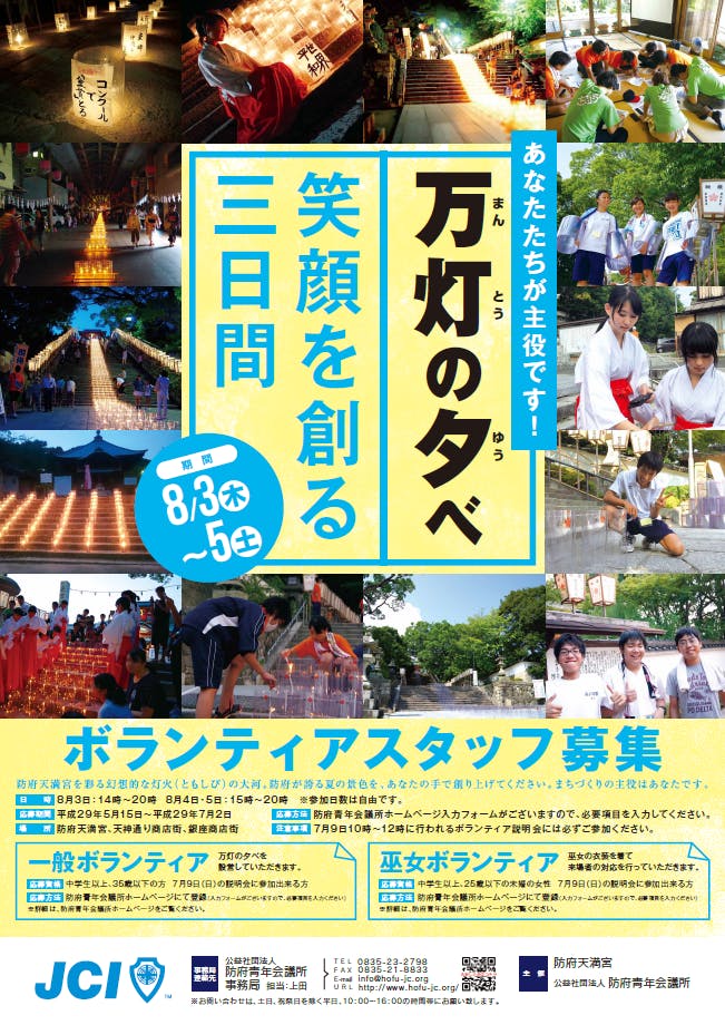 2017/05/18 15:22いつもお世話になっております。 防府青年会議所 未来のまち創造会議からご案内です。 平成29年5月15日(月)~平成29年7月2日まで万灯の夕べにおける ボランティア募集が開始されました。 対象は下記の通りとなります。 一般ボランティア・・・中学生以上、35歳以下の方 巫女ボランティア・・・中学生以上、25歳以下の未婚の女性 となります。 登録は防府青年会議所HPから手続き可能となります。 一緒に防府天満宮を彩る幻想的な灯の大河を皆様の手で創り上げませんか? まちづくりの主役はあなたです! 是非会社の従業員・知人・ご家族等多くの方をお誘いの上、 一人での多くのご登録をお待ちしております。 今後も随時情報提供してまいります。 引き続き宜しくお願いいたします。 未来のまち創造会議 一同より もっと見る