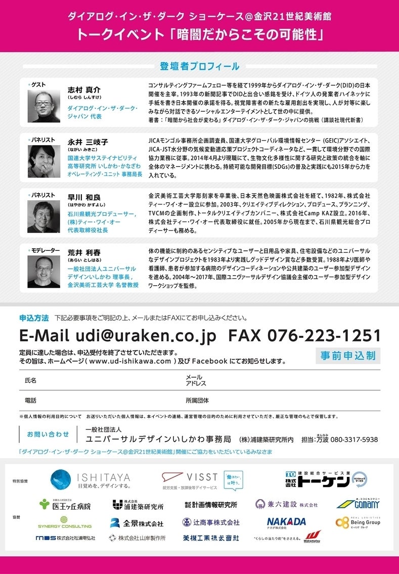 • ダイアログ・イン・ザ・ダーク ショーケース@金沢21世紀美術館 開催支援のためのクラウドファンディングにご寄付をいただき、まことにありがとうございました!! 多くの方のご支援をいただいて、開催への大きな励みになりました。本当にありがとうございます。返礼品は、送付時期にあわせて順次発送させていただきますので、ご到着をしばしお待ちいただけましたら幸いです。 *** 10/23(火)に関連のトークイベントを開催いたします。こちらも是非ご参加いただけましたら幸いです。 ~SDGs いしかわ・かなざわダイアローグシリーズ 第10回~ トークイベント「暗闇だからこその可能性」 完全に光を遮断した空間での対話は、“暗闇だからこそ”私たちにさまざまな気づきを与えてくれます。北陸初開催となる「ダイアログ・イン・ザ・ダーク ショーケース@金沢21世紀美術館」を記念し、対等な関係性が育む可能性や創造性について考えるトークイベントを開催します。 日時: 2018. 10.23(火) 18:00~19:15会場: 金沢21世紀美術館 シアター21 【参加無料・事前予約制】 主催:(一社)ユニバーサルデザインいしかわ(UDi)共催:国連大学サステイナビリティ高等研究所 いしかわ・かなざわオペレーティング・ユニット 申込方法【氏名、メールアドレス、電話、所属団体】を明記の上、事務局までメール(udi@uraken.co.jp)にてお申し込みください。 登壇者 荒井 利春  一般社団法人ユニバーサルデザインいしかわ 理事長, プロダクトデザイナー,金沢美術工芸大学 名誉教授 志村 真介  ダイアログ・イン・ザ・ダーク・ジャパン 代表 永井三岐子  国連大学サステイナビリティ高等研究所 いしかわ・かなざわオペレーティング・ユニット 事務局長 早川 和良  石川県観光プロデューサー, CMディレクター, (株)ティー・ワイ・オー 代表取締役社長 *** この活動は、国連大学サステイナビリティ高等研究所いしかわ・かなざわオペレーティング・ユニットが地域のパートナーとすすめる「SDGsいしかわ・かなざわダイアローグ」の一環で開催しています。 <SDGs(持続可能な開発目標)とは>2015年9月、国連サミットで採択された「持続可能な開発のための2030アジェンダ」にて記載された2016年から2030年までの国際目標です。持続可能な世界を実現するための17のゴール・169のターゲットから構成され、地球上の誰一人として取り残さない(leave no one behind)ことを誓い、発展途上国のみならず、先進国自身の普遍的な取組を推進しています。 もっと見る