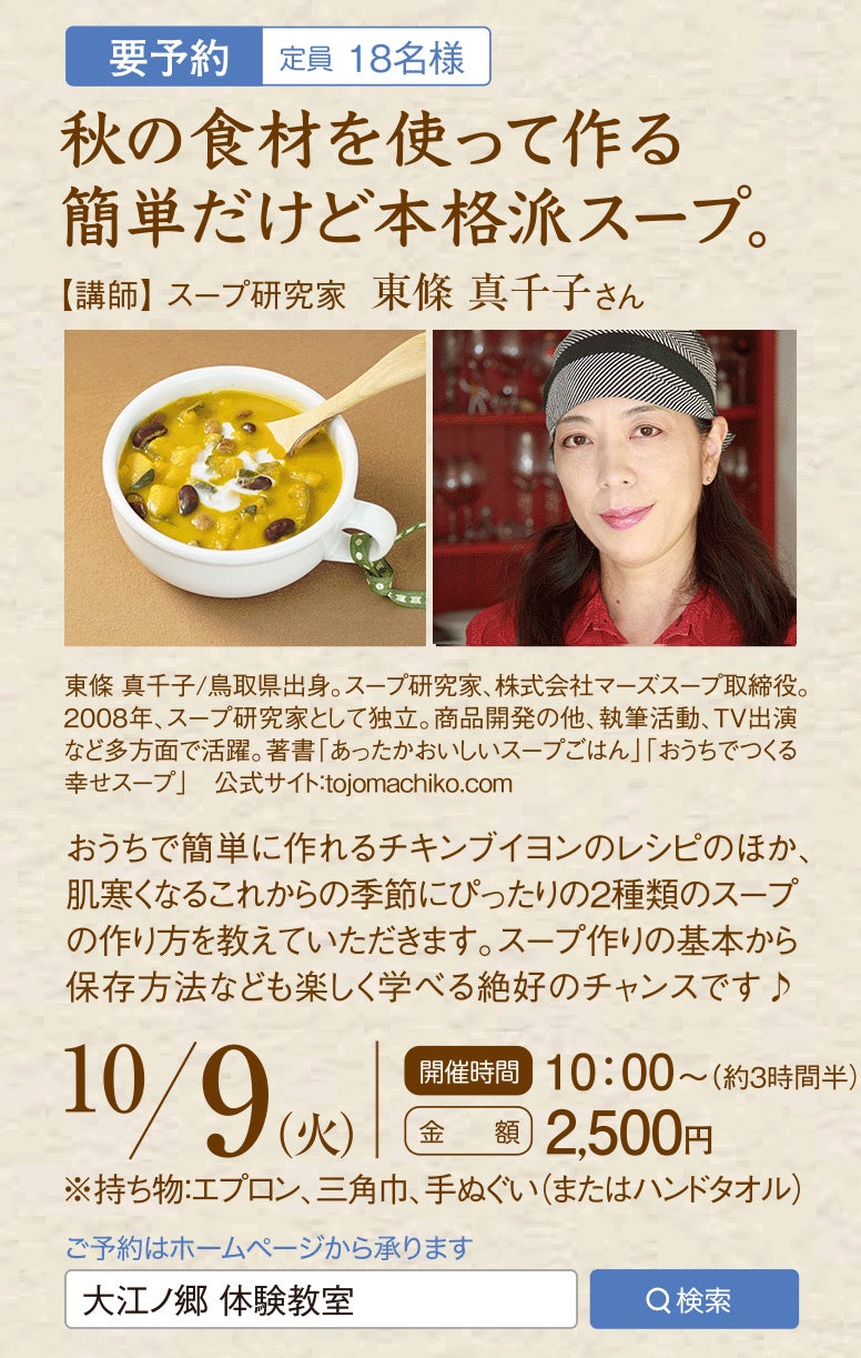 大江の郷は鳥取県の超人気スポットで、こちらの卵は本当に美味しいんです。どれだけ真面目に作ったらこんなにおいしい卵ができるのかと感動するほど。大好きな大江の郷の体験教室で、10月9日(火)たっぷり3時間半、チキンブイヨンの簡単な作り方、秋のスープ2種、大江の郷の卵とパンを使ったサンドイッチなどを作ります。お近くの方はどうぞご参加くださいね!