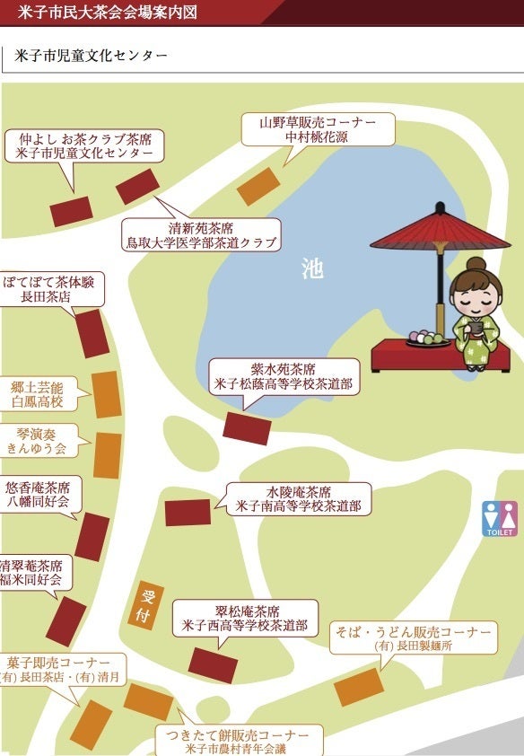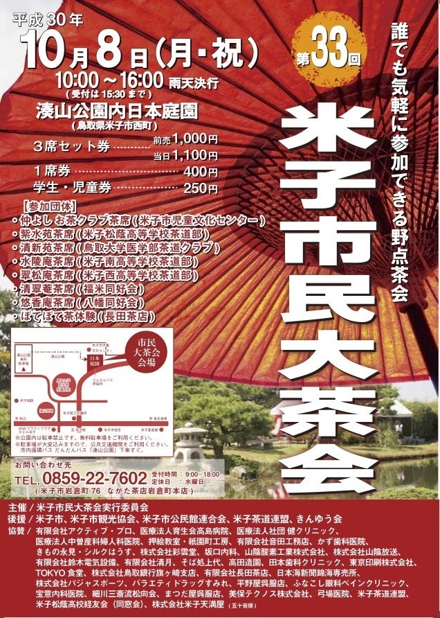 以前は米子市が主催していましたが、現在は民間の高校、大学の茶道部や公民館のお茶教室、琴の教室などが集まり自前の資金と協賛金を元に運営させていただいています。