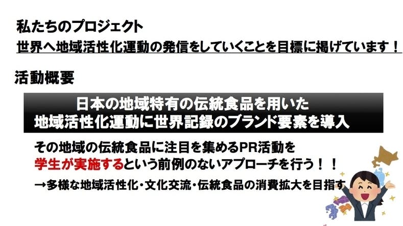 今回は、日本国内地域特有の伝統食品を用いた地域活性化運動を世界記録のブランド要素を導入することで、その地域の伝統食品に対する注目を大きくするPR活動を学生が実施するという前例のないアプローチによって、「伝統食品の新しい観光資源化 とそれをきっかけとした地域訪問者の増大、そこから派生する他地域における地域活性化手法にも影響する活動及び人材の創出」を目指して頑張ります!