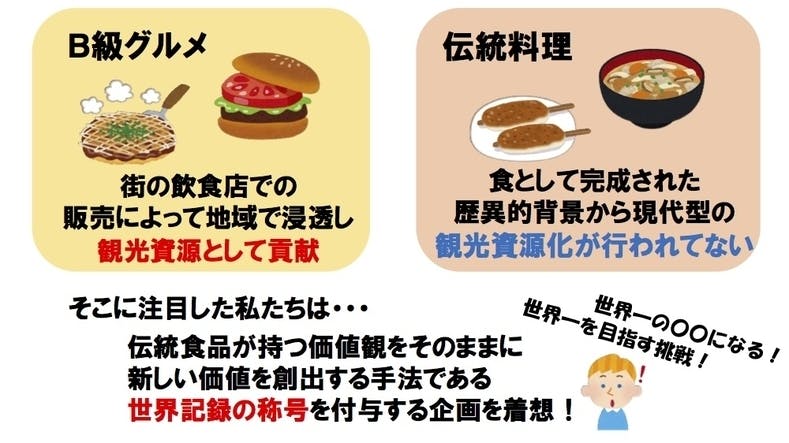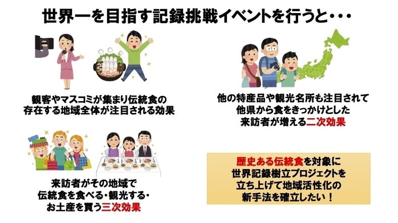 これらの利点を生み出すツールとして、我々は伝統食を対象とした世界記録樹立プロジェクトを立ち上げ、地域活性化の新手法を確立したいと考えています。
