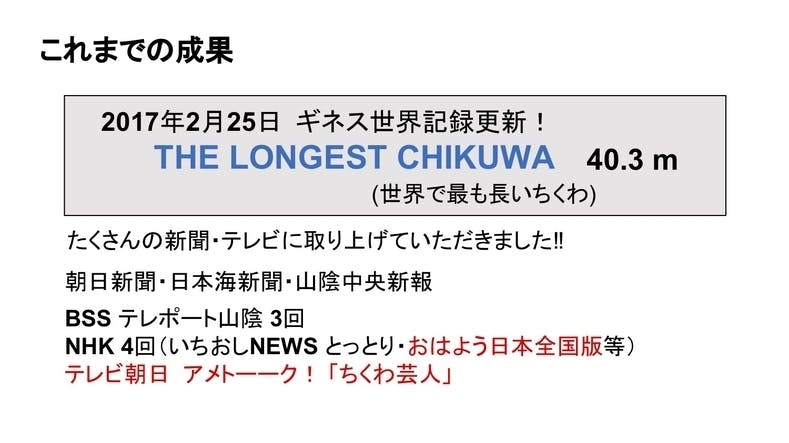 2018/11/30 14:54大変お待たせいたしました!! 支援して頂いた方へリターン品の発送をしました!! 感謝を込めて製作・発送させていただきましたので 是非、使っていただきたいと思います! 欠陥品がございましたらご連絡ください。対応いたします。 メールアドレス(tanilab_chikuwa@outlook.jp) ギネスへの登録はあと1週間程かかりそうです... 皆様によいご報告ができることをこちらもたのしみに待っています! ※20,000円の支援をしていただいた方へのギネス証の発送は 後日となりますので、ご了承ください。 もっと見る